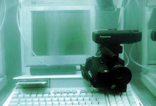 aquarium, air pump, water, laptop computer, video camera, cell phone,
